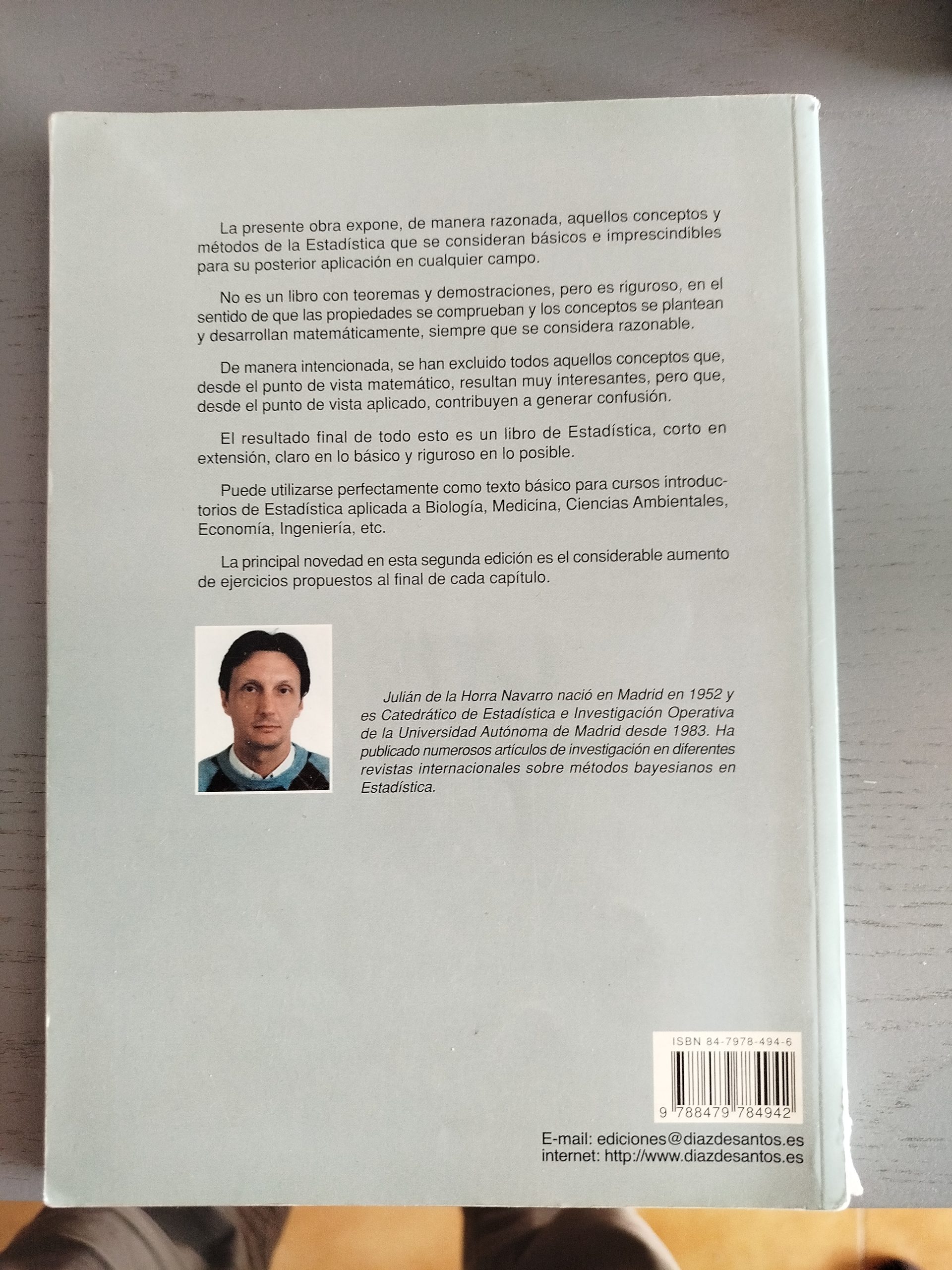 Obra introductoria que presenta de forma razonada los conceptos y métodos básicos e imprescindibles de la Estadística para su aplicación en cualquier campo. Es rigurosa pero evita un enfoque excesivamente teórico; excluye conceptos que, siendo interesantes desde el punto de vista matemático, pueden generar confusión en la práctica. Idónea como texto básico para cursos iniciales de Estadística aplicada a Biología, Medicina, Ciencias Ambientales, Economía e Ingeniería. La segunda edición destaca por el aumento de ejercicios al final de cada capítulo.