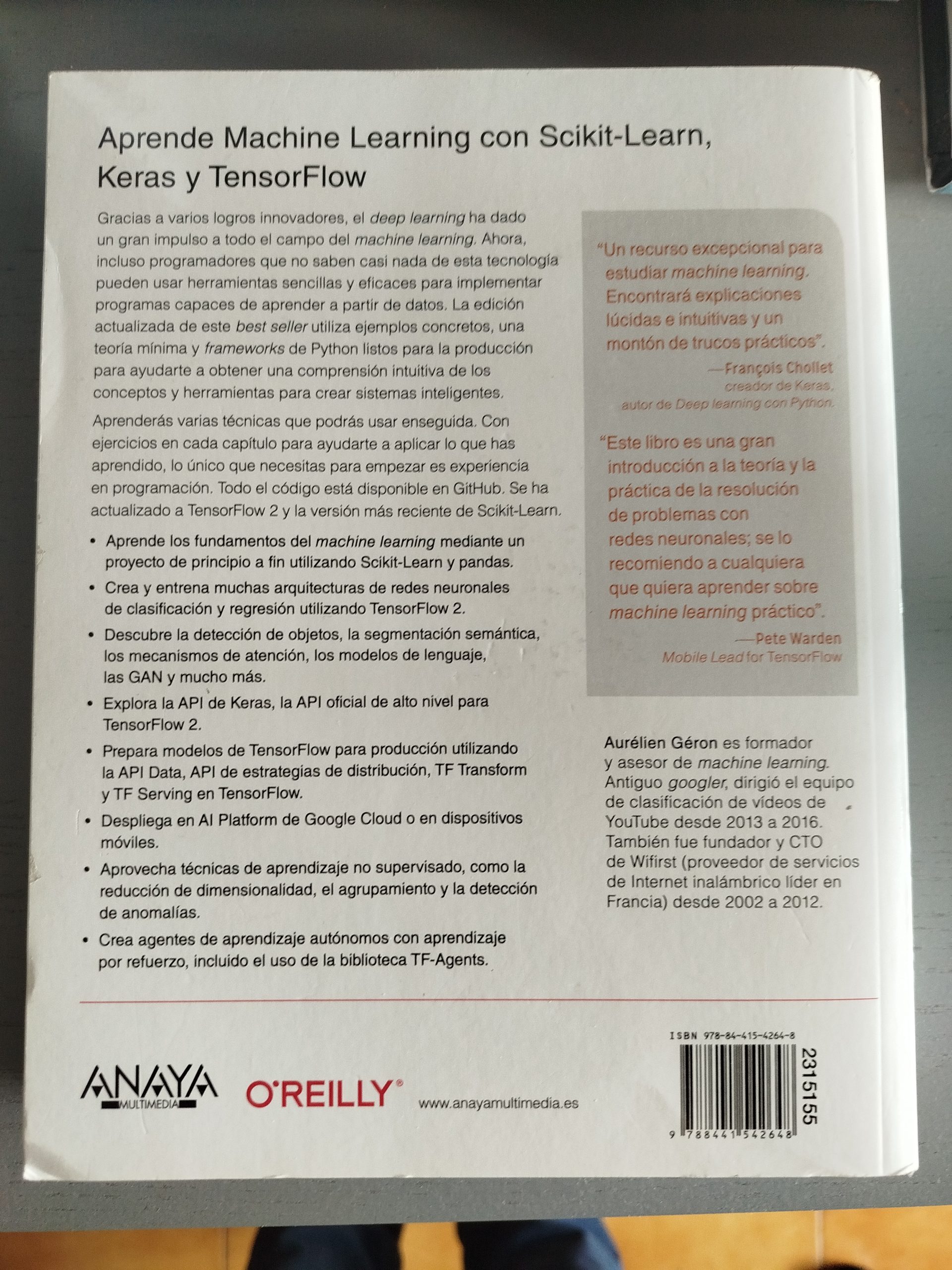 2ª edición. Actualizado para TensorFlow 2. Funciona con Jupyter. Coedición O’Reilly / Anaya Multimedia.